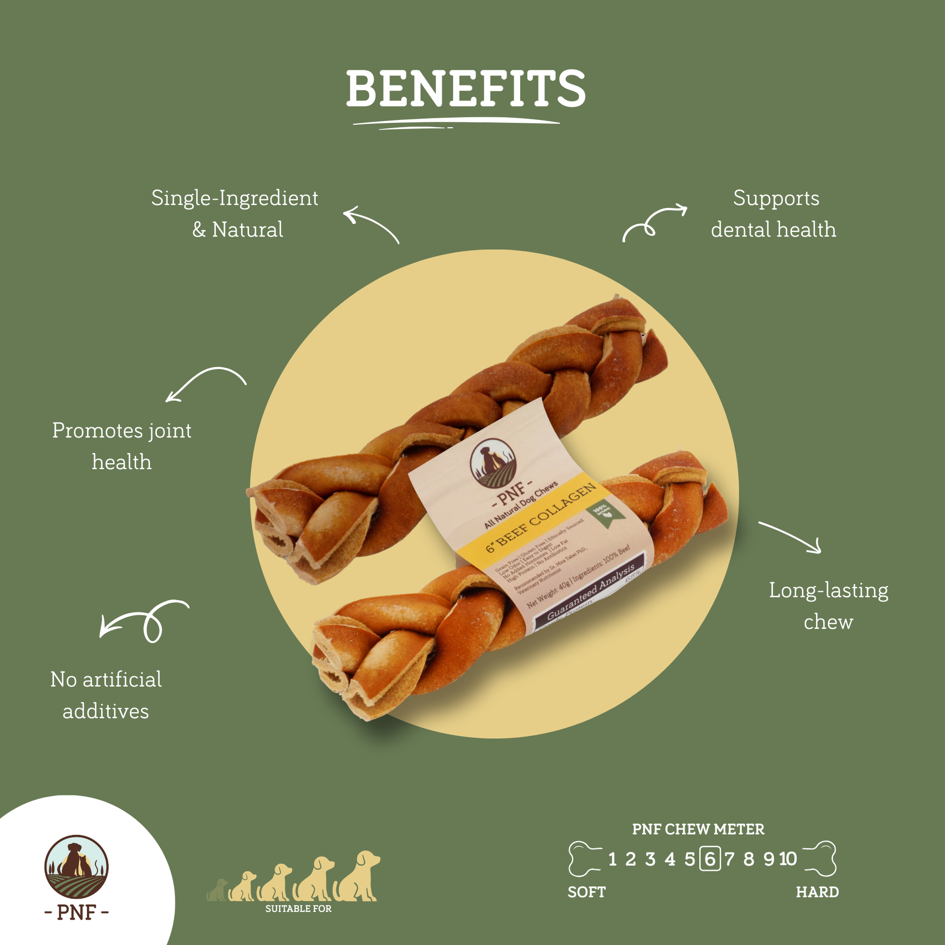 Our 6" Braided Beef Collagen chew are tough chews that will keep your dog entertained for a long time. These chews are high in protein, low in fat, and tough, making them the perfect choice for natural enrichment and dental care, while also providing long-lasting enjoyment.