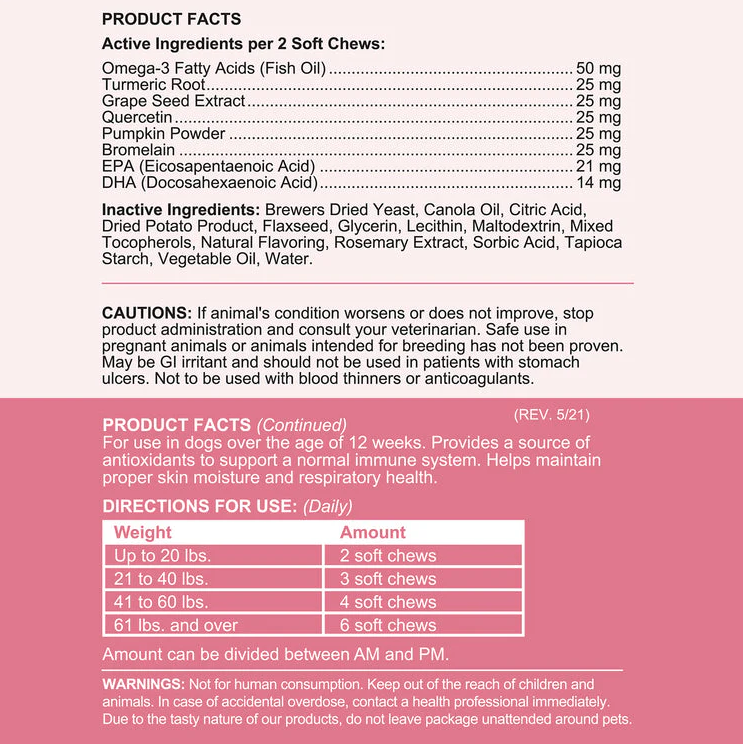 - Dogs between 41 to 60 lbs should be given 4 soft chews, while those 61 lbs and over should receive 6 soft chews daily