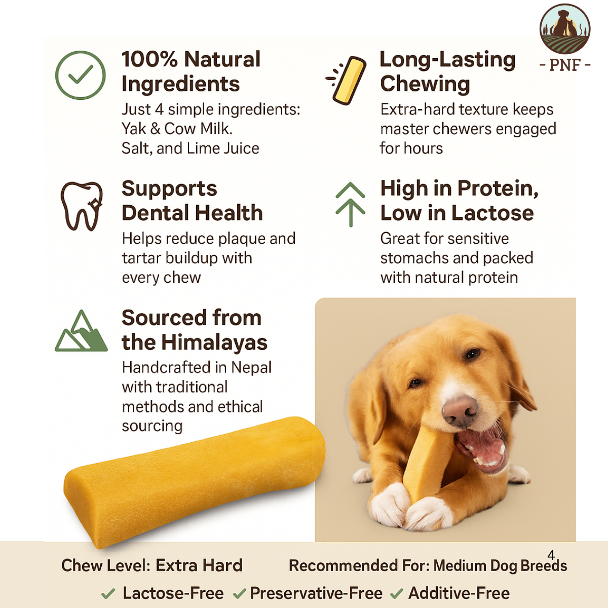 • Lactose-Free: Himalayan chews are naturally low in lactose, making them suitable for dogs with lactose sensitivities or allergies.