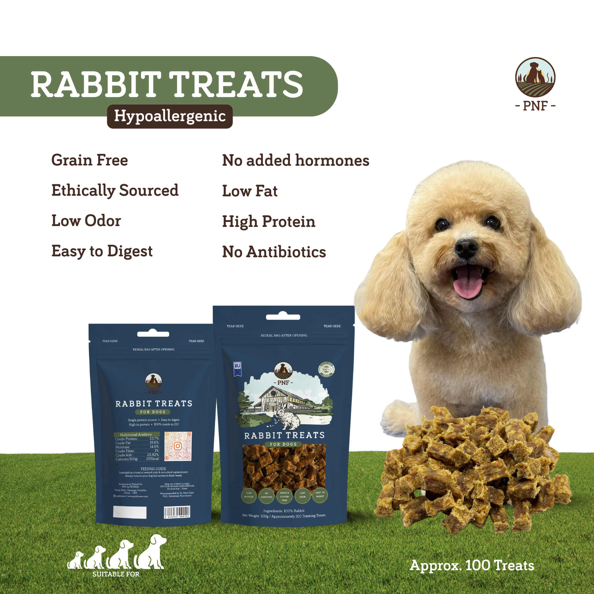 Our Rabbit training treats are made from 100% high-quality rabbit. These hypoallergenic savory snacks are perfect for training or simply as a tasty reward.